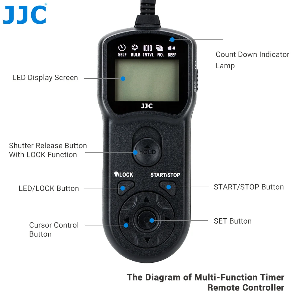 La télécommande de minuterie multifonctionnelle de la série JJC TM est conçue pour fonctionner comme une télécommande de minuterie et un intervalomètre. Il est excellent pour la floraison des fleurs, le coucher du soleil, le rase de lune, etc. photographie. La télécommande est équipée pour gérer une longue liste de fonctions de minuterie : retardateur, minuterie longue exposition, minuterie d'intervalle, ainsi que pour contrôler le nombre de tirs. Une exposition jusqu'à 99 heures, 59 minutes et 59 secondes peut être programmée et le nombre d'expositions peut aller jusqu'à 399 ou illimité. Appuyez simplement sur les boutons, les paramètres s'afficheront sur l'écran LCD. Il y a un rétroéclairage sur l'écran LCD qui permet une vision nocturne. La télécommande de la minuterie multifonction peut également être utilisée comme câble de déclenchement : appuyez à mi-chemin pour mettre la mise au point ; appuyez complètement pour déclencher l'obturateur ; lorsque vous prenez des photos à longue exposition, appuyer sur le bouton de l'obturateur vers le haut verrouillera l'obturateur de l'appareil photo. La télécommande aide également à prévenir les secousses de l'appareil photo et vous permet de prendre des auto-retraits. Toutes les fonctionnalités de la télécommande TM en font une bonne aide pour prendre des photos créatives.