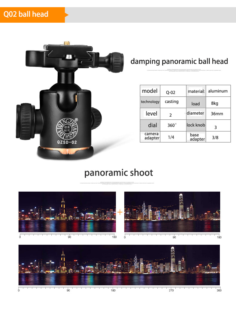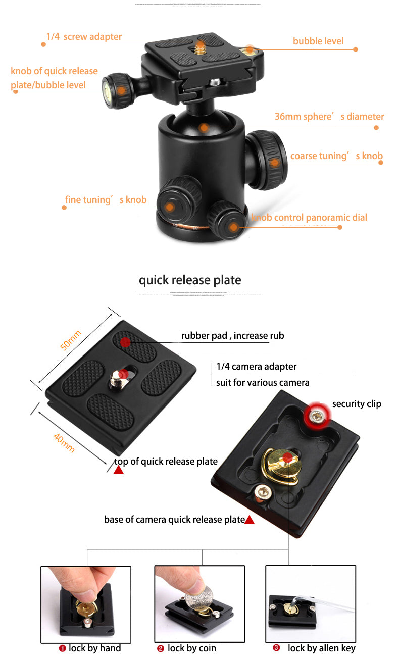 9. Rotule Métal: Peut être tourné 360 degrés, permet à votre reflex une large gamme de prise de vue panoramique. (la bulle niveau aider à juge le niveau et la position exacte)