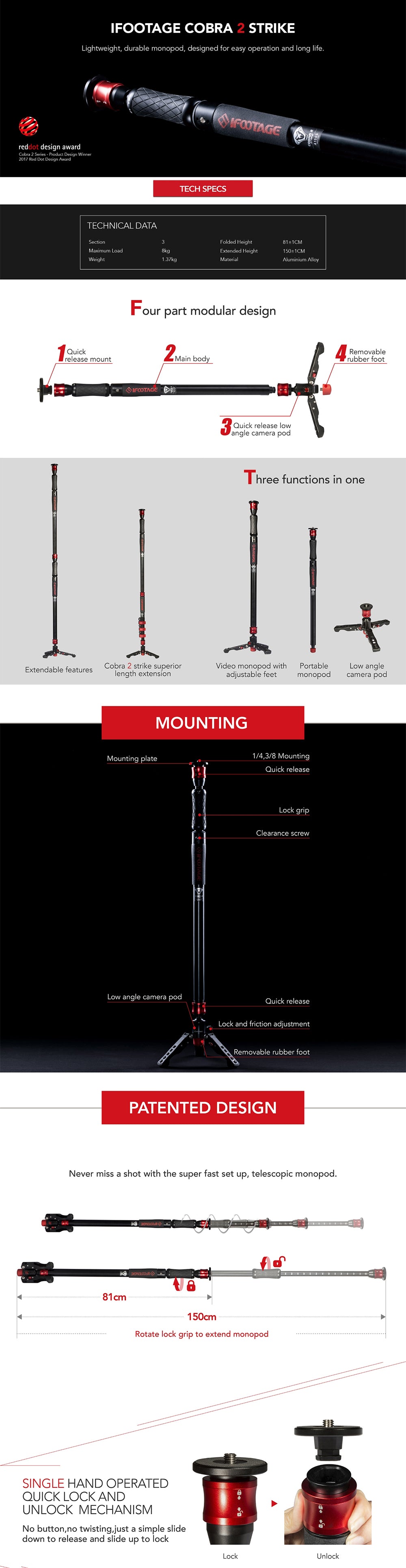 Le petit+: Charge utile 8kg Monopod, qualité proféssionnelle.