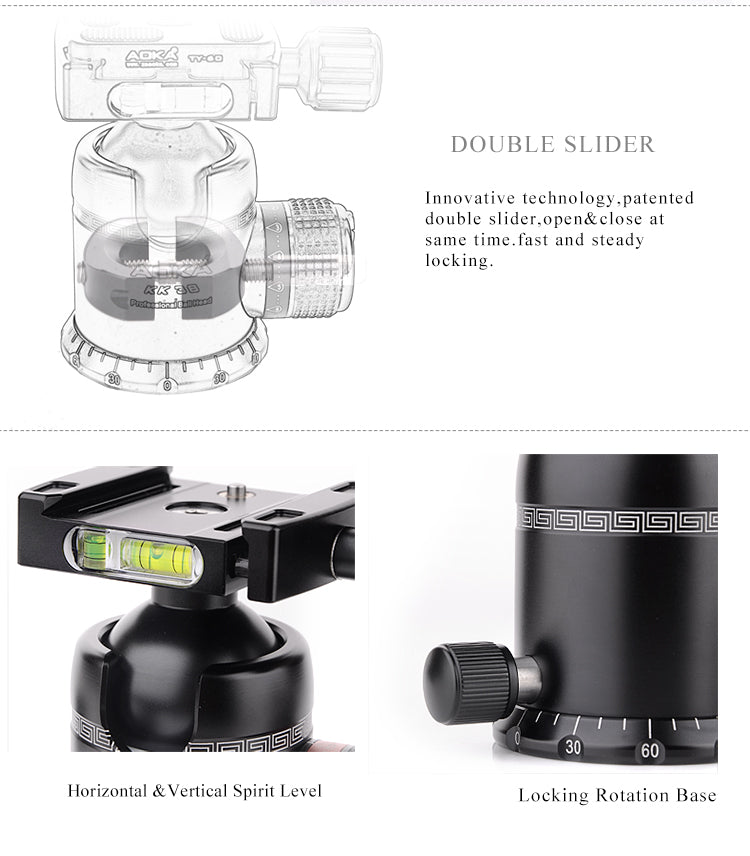 Trépied tripod de qualité professionnelle haut de gamme. Alliage aluminium. Robustesse accru. Système lock. Pied détachable pour transformer en monopod. Utilisable en simple base. Partie démontable. Conçu spécialement pour les photographes et cameraman professionnel. Rotule KK38 incluse.