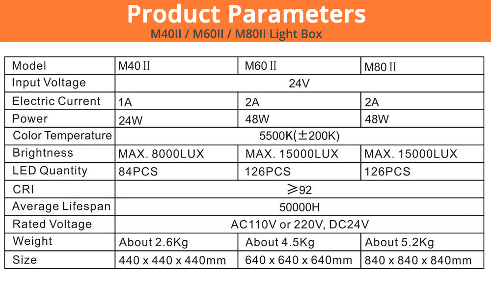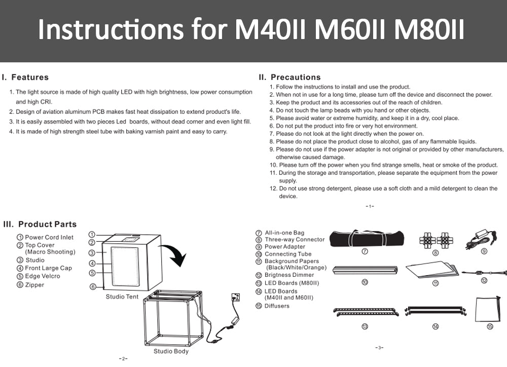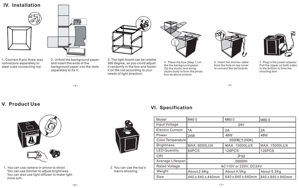 1. The light source is made of high-quality LEDs with high brightness, low power consumption and high CRI. 2. It is easily led with two pieces of LED boards, no dead corner and even light filling. 3. Multi-angle Shooting: The front window supports horizontal shooting and the open window on the top supports 90-degree vertical shooting. Allow you to take great white background photos with different devices: iPhone, smart phones, cameras or professional cameras. 4. High-quality Lights: The perfect daylight temperature for professional images provides the right amount of light to produce bright and vibrant photos. 5. Easy to Carry: This photo studio is designed to be both lightweight and sturdy while equipped with a carrying bag, easy to carry.