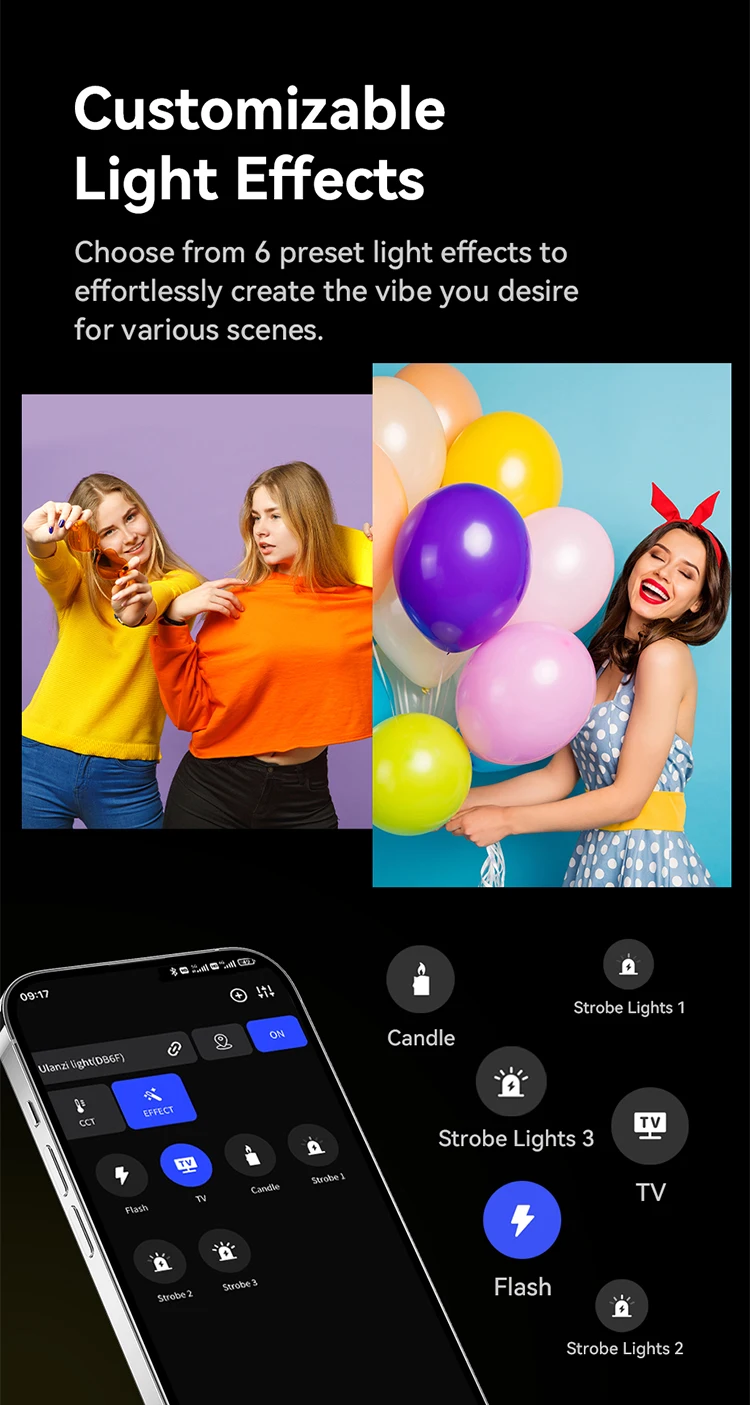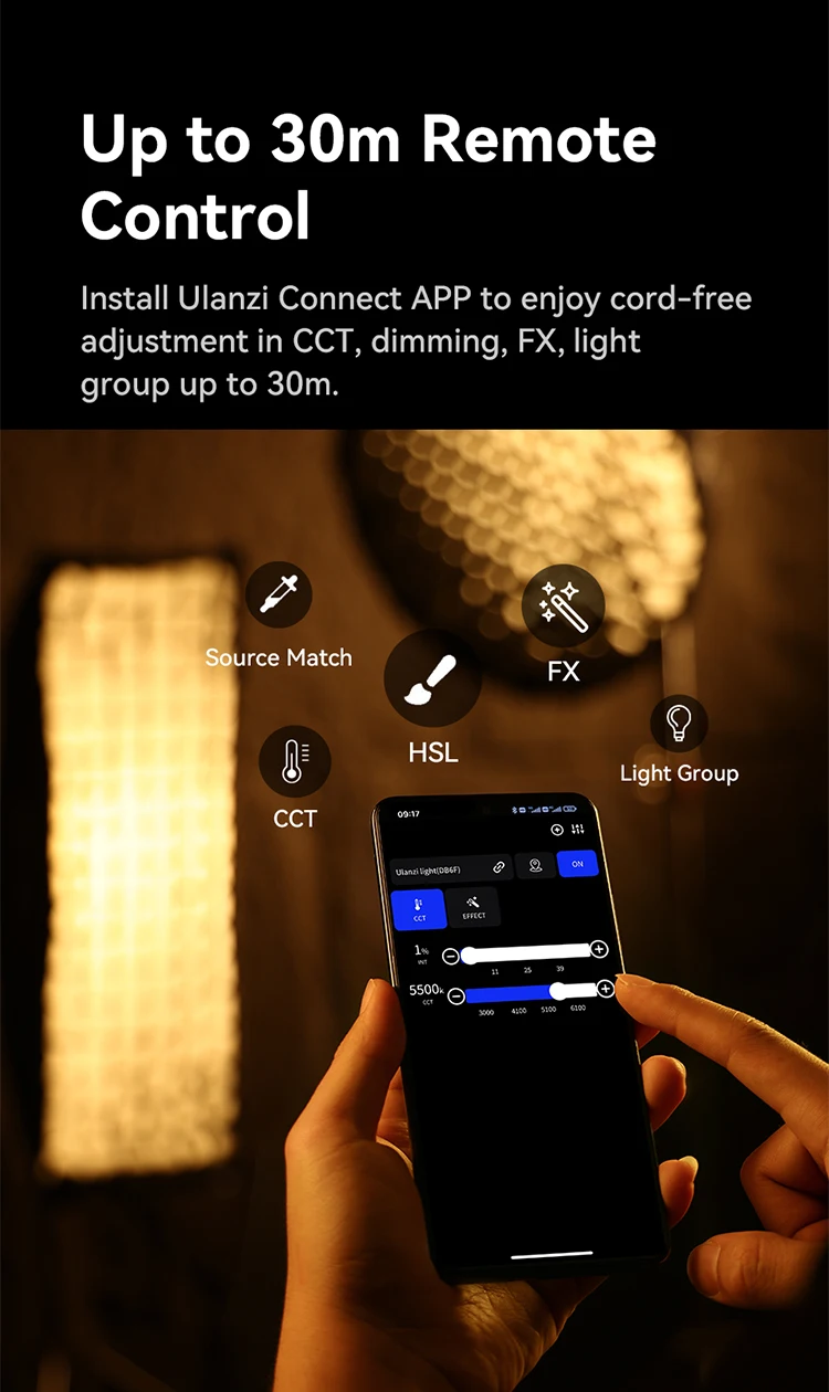 Installez l'application Ulanzi Connect pour profiter d'un réglage sans fil du CCT, de la gradation, des effets, du groupe d'éclairage jusqu'à 30 m