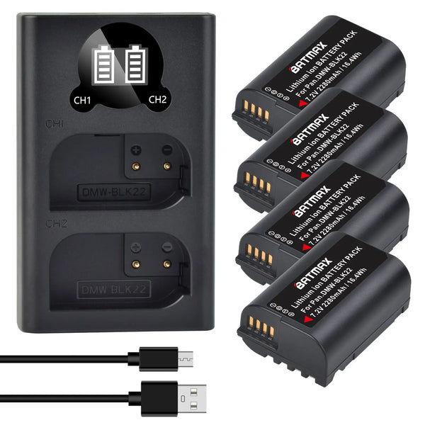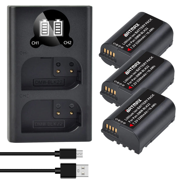 Batterie Batmax DMW-BLK22 BLK22 2280mAh + chargeur double pour Panasonic LUMIX DC-S5, DC-S5K, GH5 II, GH6, S5M2, S5M2X, GH5M2