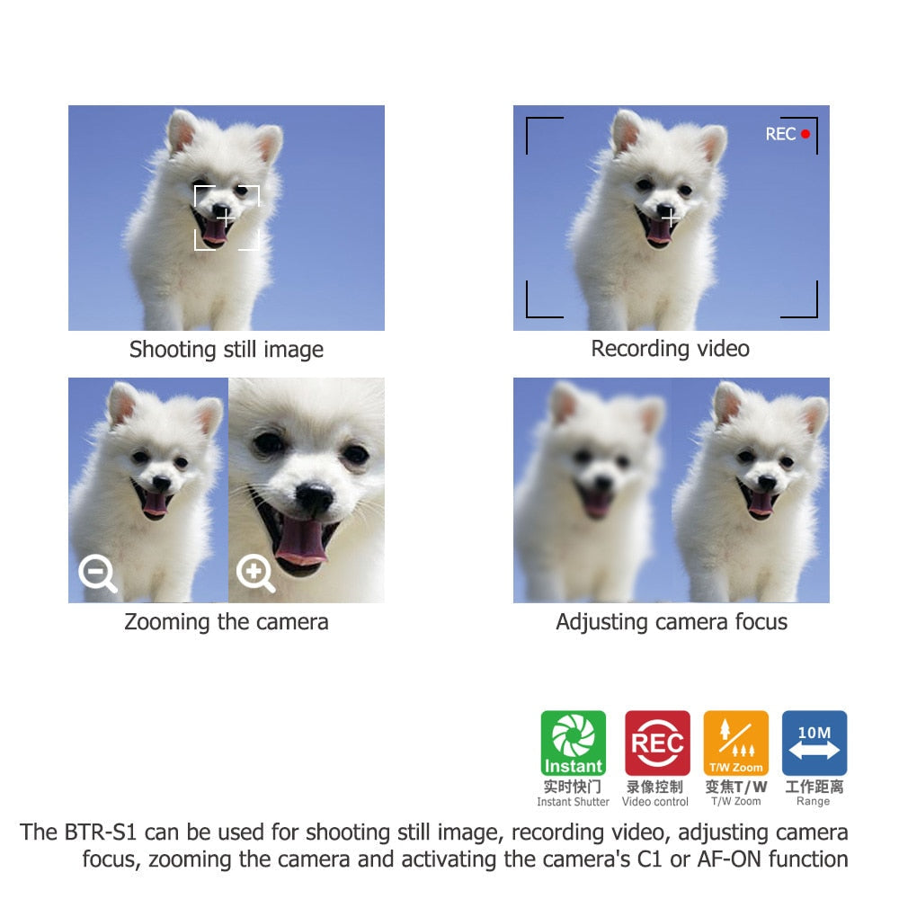 La télécommande sans fil est spécialement conçue pour certains appareils photo Sony. Il vous permet de télécommander votre caméra sans fil avec une distance de fonctionnement d'env. 10 m / 32,8' dans n'importe quelle direction. Le BTR-S1 peut être utilisé pour prendre des photos, enregistrer des vidéos, régler la mise au point de l'appareil photo, agrandir l'appareil photo et activer la fonction C1 ou AF-ON de l'appareil photo. Vous pouvez désactiver tous les boutons de la télécommande afin d'éviter des opérations involontaires pendant que vous la transportez en faisant glisser le commutateur LOCK sur la position "LOCK".