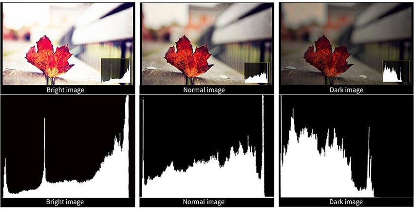 L'histogramme de luminosité est un outil quantitatif pour vérifier la luminosité de l'image. La caractéristique montre la distribution de la luminosité dans une image sous forme de graphique de la luminosité le long de l'axe horizontal (gauche: sombre, droite: lumineux) et une pile du nombre de pixels à chaque niveau de luminosité le long de l'axe vertical.
