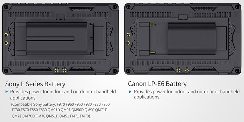 Un port de sortie cc vous permet d'alimenter votre appareil photo directement à partir d'une batterie NP-F de la série L ou LP-E6 montée sur le moniteur, augmentant les temps d'exécution par rapport aux batteries standard de nombreux appareils photo reflex numériques ou sans miroir. De plus, vous pouvez surveiller l'audio à l'aide de la prise casque stéréo 3.5mm.