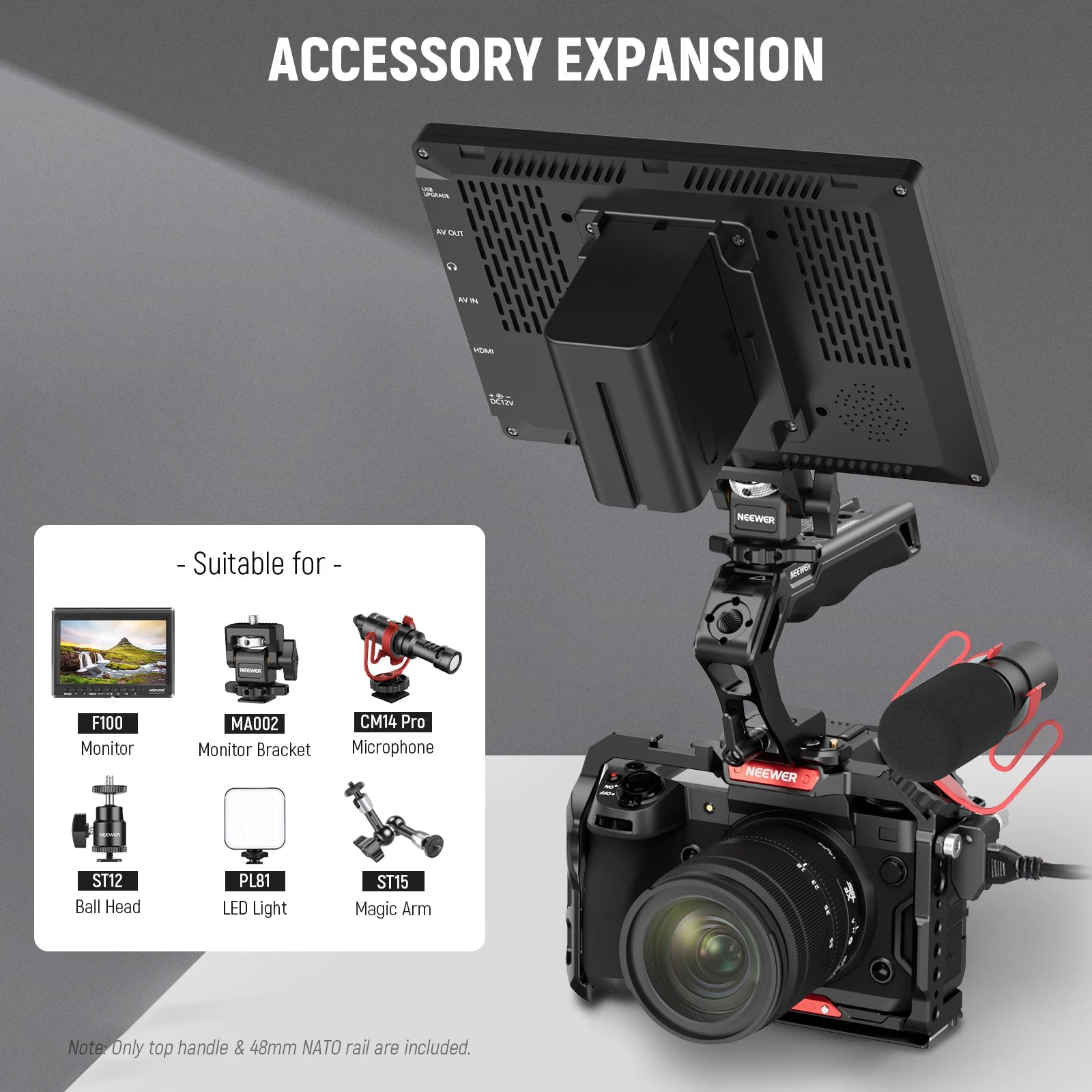 【Supports de chaussures froides intégrés 】Trois supports de sabot froid vous permettent de fixer un moniteur de terrain, un microphone d'interview et une lumière vidéo LED à la poignée supérieure pour une qualité vidéo élevée