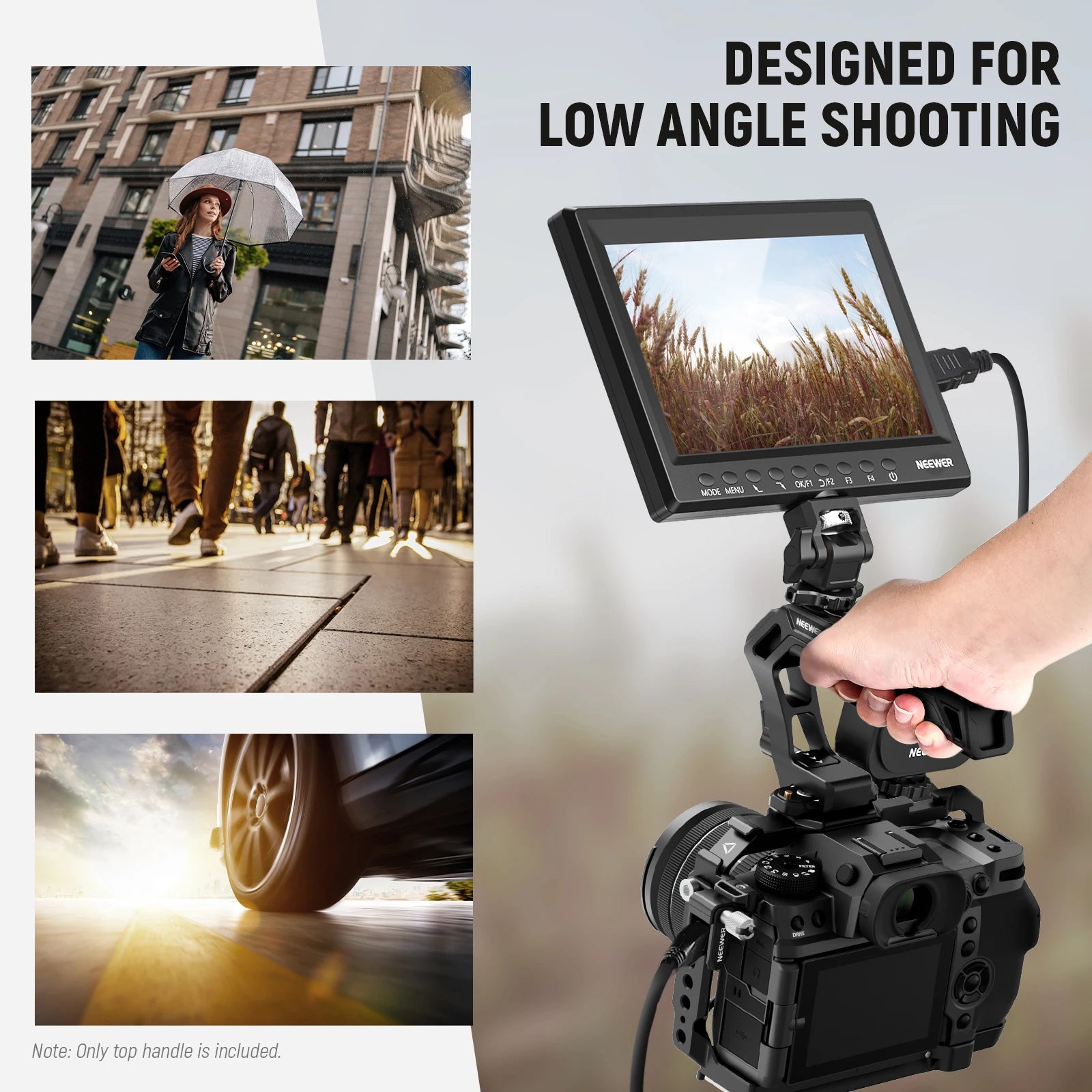 【Prise ferme et confortable】De conception ergonomique, la poignée supérieure présente un contour profilé qui s'adapte à votre main, et le revêtement en caoutchouc souple ajoute de la friction pour une prise de vue stable à faible angle en déplacement
