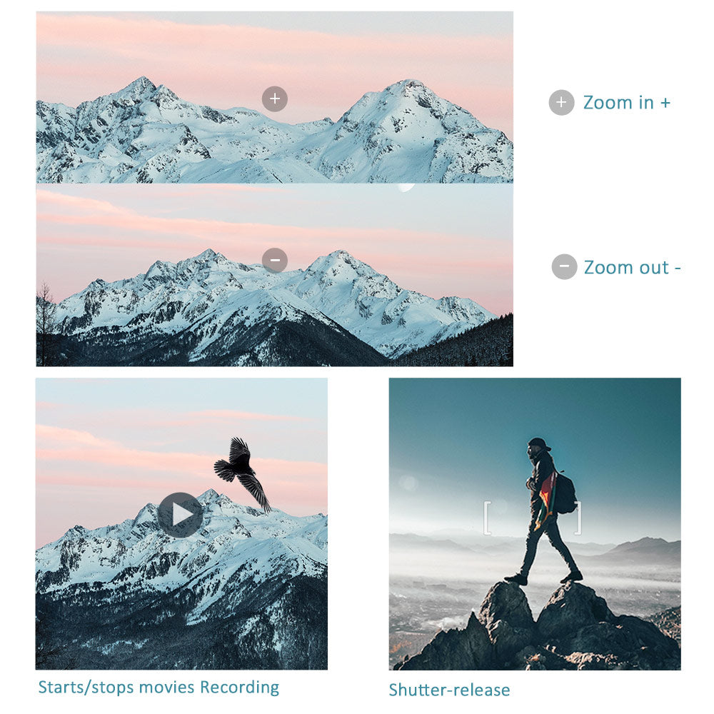 >> Un déclencheur et un bouton d'enregistrement vidéo sur la télécommande peuvent être utilisés pour prendre des photos et démarrer/arrêter des vidéos de films.
