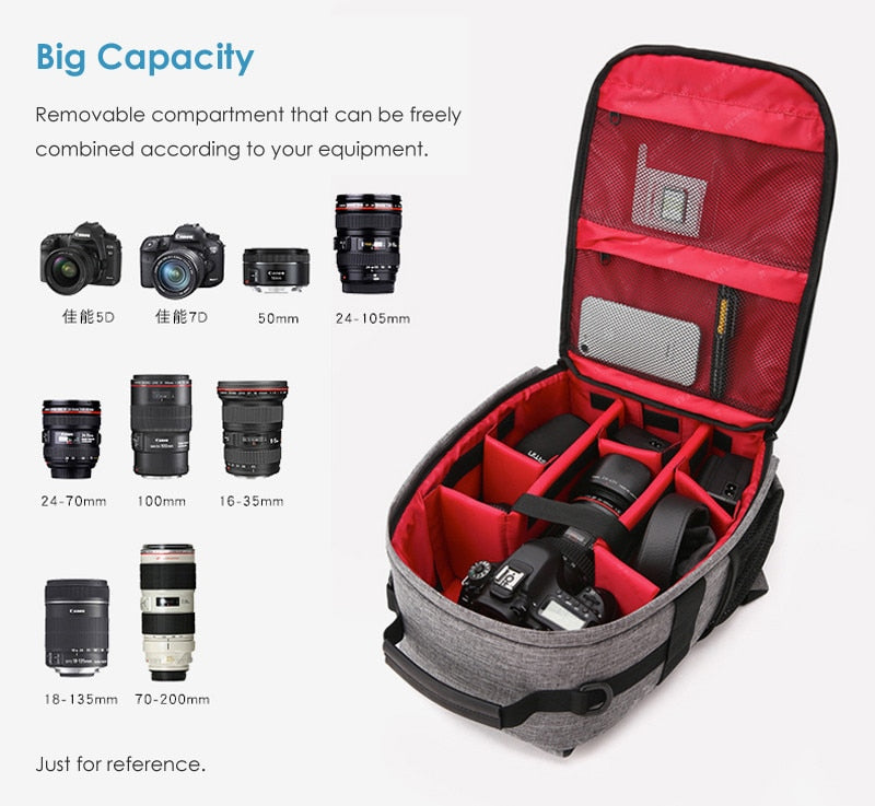 Capacité: 1 x DSLR + 3 x objectif + 1 x Flash + 2 x Tripod+ autre accessoires