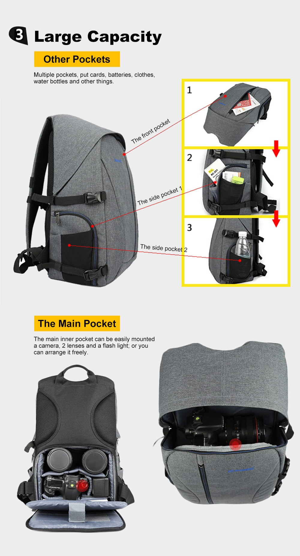 Plusieurs poches pour vos cartes mémoires, batteries, vêtements, bouteilles d'eau etc.