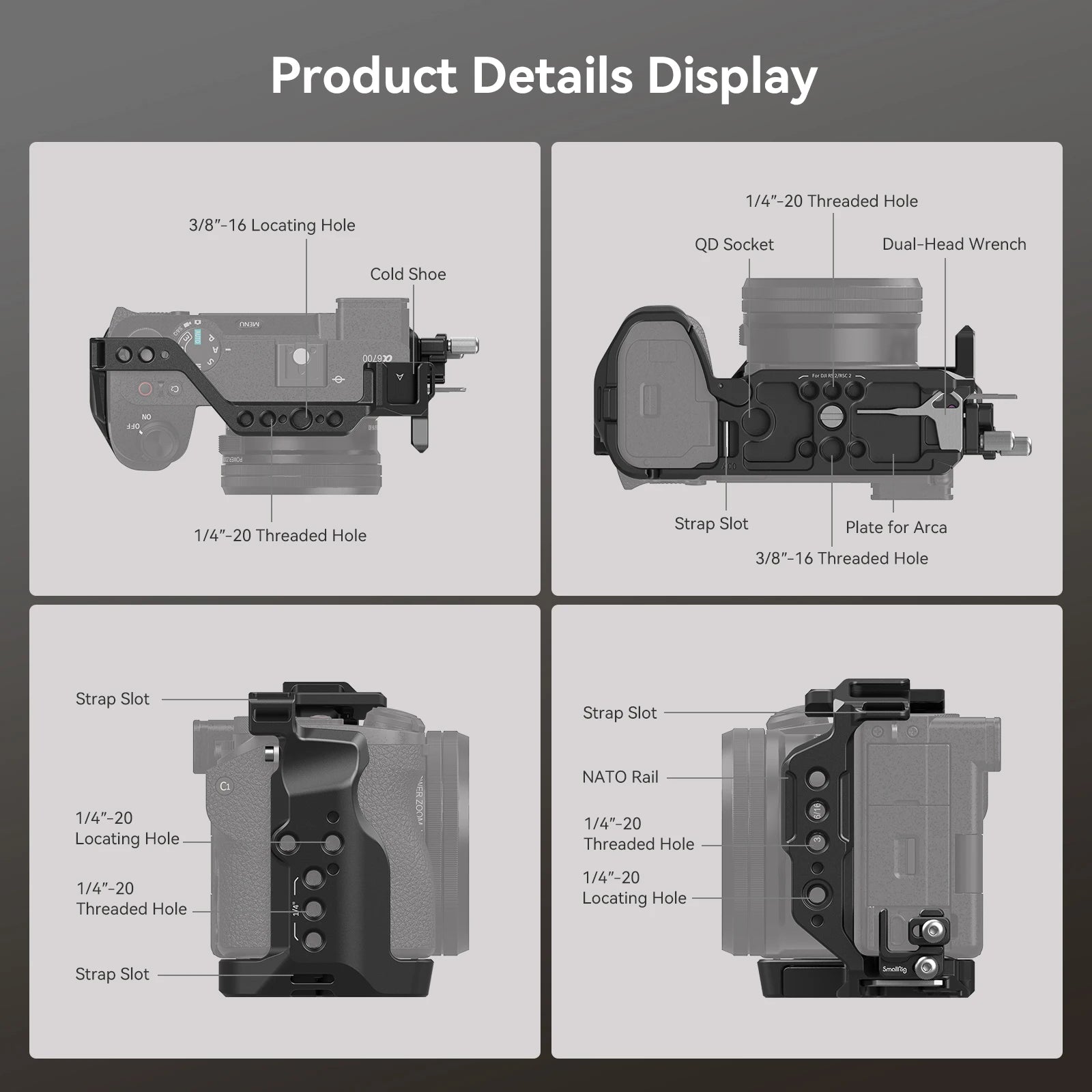 3. Protection intégrale : La cage tout-en-un s'adapte parfaitement au Sony A6700. Elle se verrouille grâce à une vis 1/4"-20 et une vis M2,5, ce qui permet un accès complet aux ports, aux commandes et au compartiment à batterie, tout en protégeant votre appareil photo portable.
