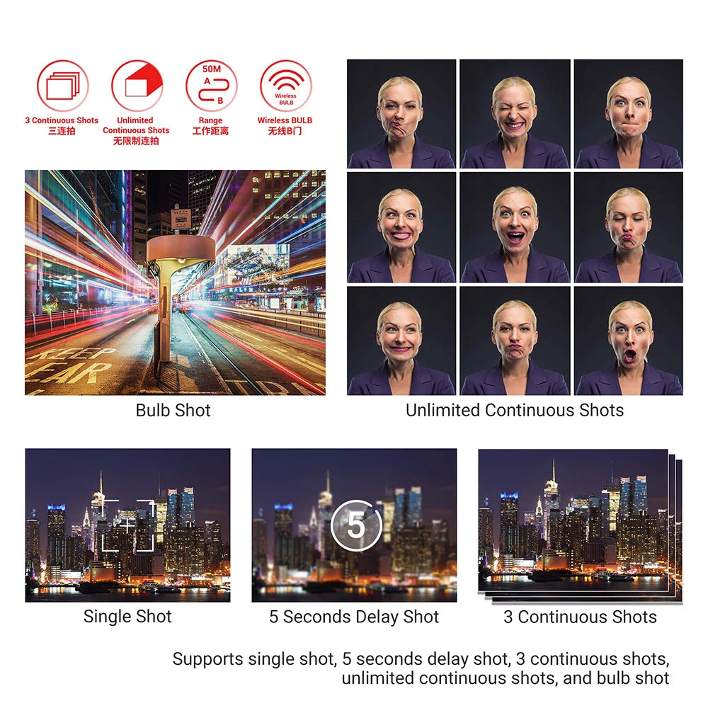 4. Prend en charge un seul tir, 5 secondes de retard, 3 tirs continus, tirs continus illimités et tir à ampoule