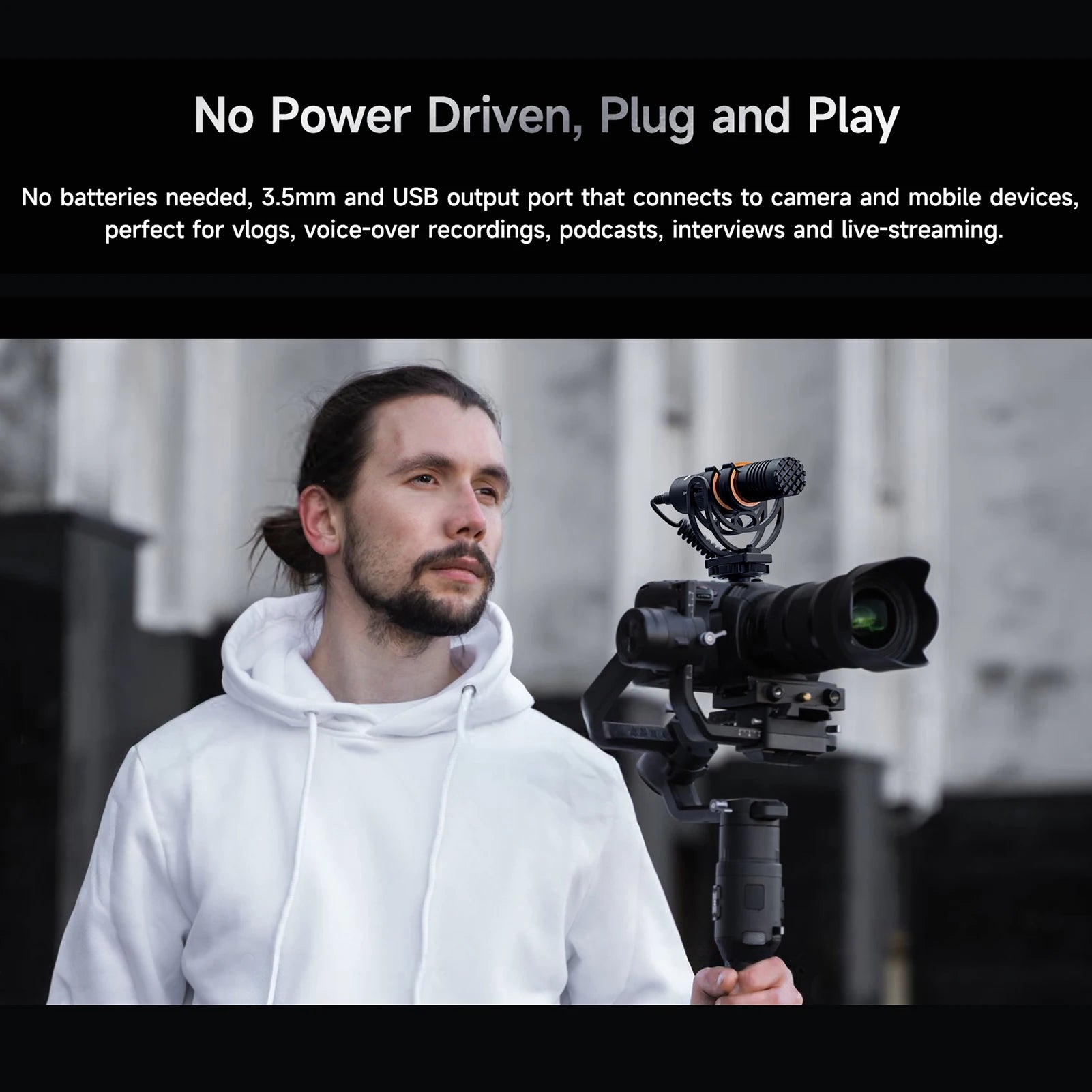 Aucune batterie requise: Ce microphone est alimenté directement via ses interfaces de sortie 3.5mm et USB-C, ce qui le rend parfait pour les prises de vue vidéo courtes, les enregistrements de voix off, les interviews, la diffusion en direct, et plus encore.