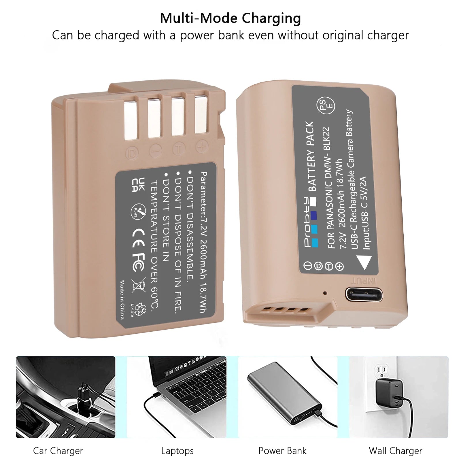 Batterie Probty DMW-BLK22 DMW BLK22, 2600mAh, avec charge USB-C, pour appareils photo Panasonic LUMIX DC-S5 DC-S5 II DC-S5 IIX GH5 II GH6 GH5M2