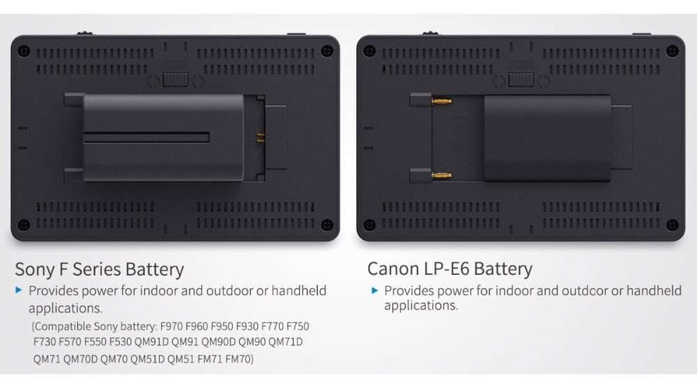 Plaque de batterie deux-en-un intégrée, compatible avec les batteries Sony série F et Canon LP-E6, offrant des conditions de travail de longue durée. Vous n'avez pas besoin d'acheter des plaques de batterie séparément. (Remarque: aucune pile n'est incluse.)