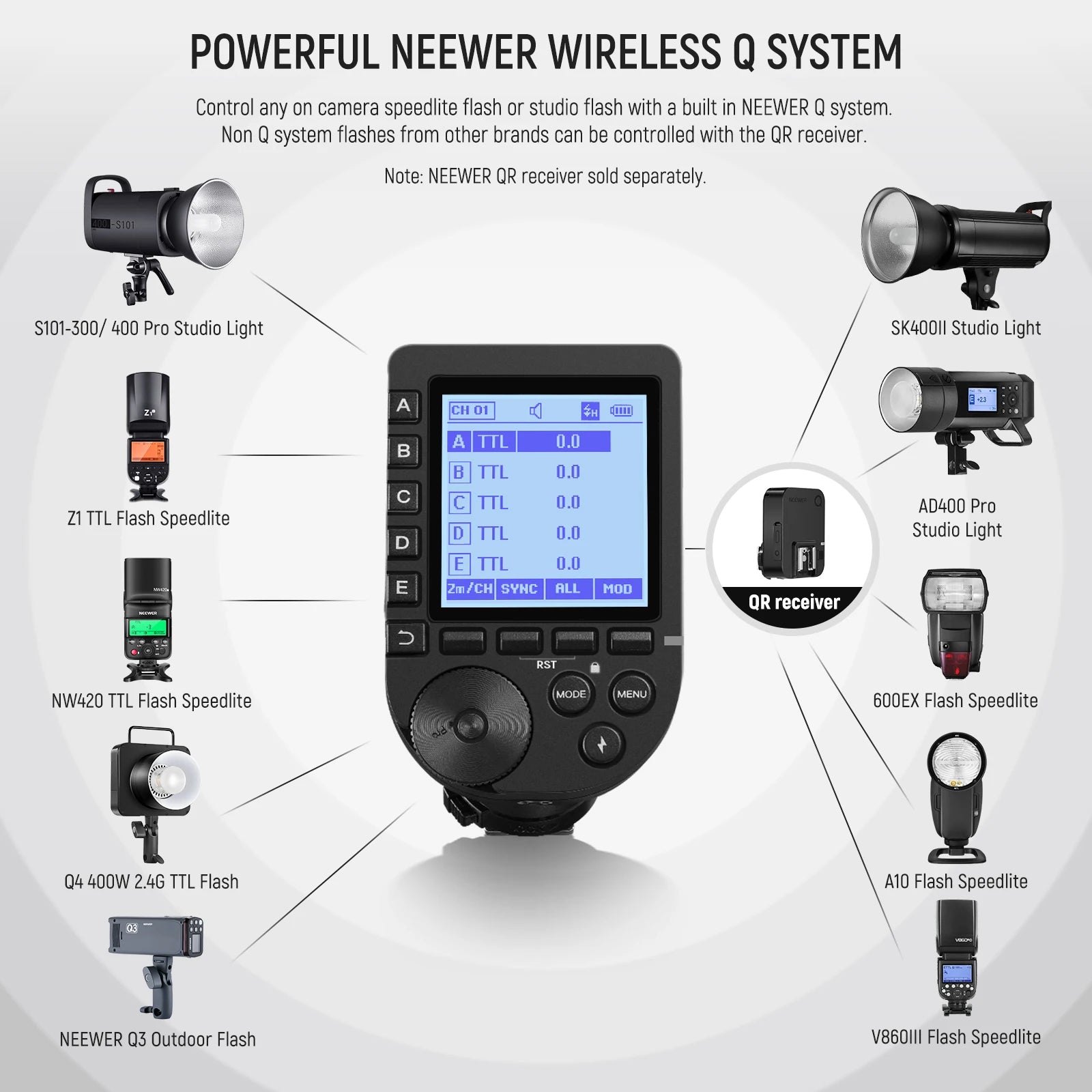 2. Déclenchement sans fil des flashs d'appareil photo, des flashs d'extérieur et des flashs de studio avec le système Q sans fil intégré de NEEWER (NEEWER Q4 Q3 Z2 Z1 Z760 NW760 S101-300W PRO/400W PRO), et peut contrôler d'autres flashs ou volets d'appareil photo sans système Q intégré (nécessite un récepteur QR NEEWER et un cordon de synchronisation de 2.5mm, tous vendus séparément).
