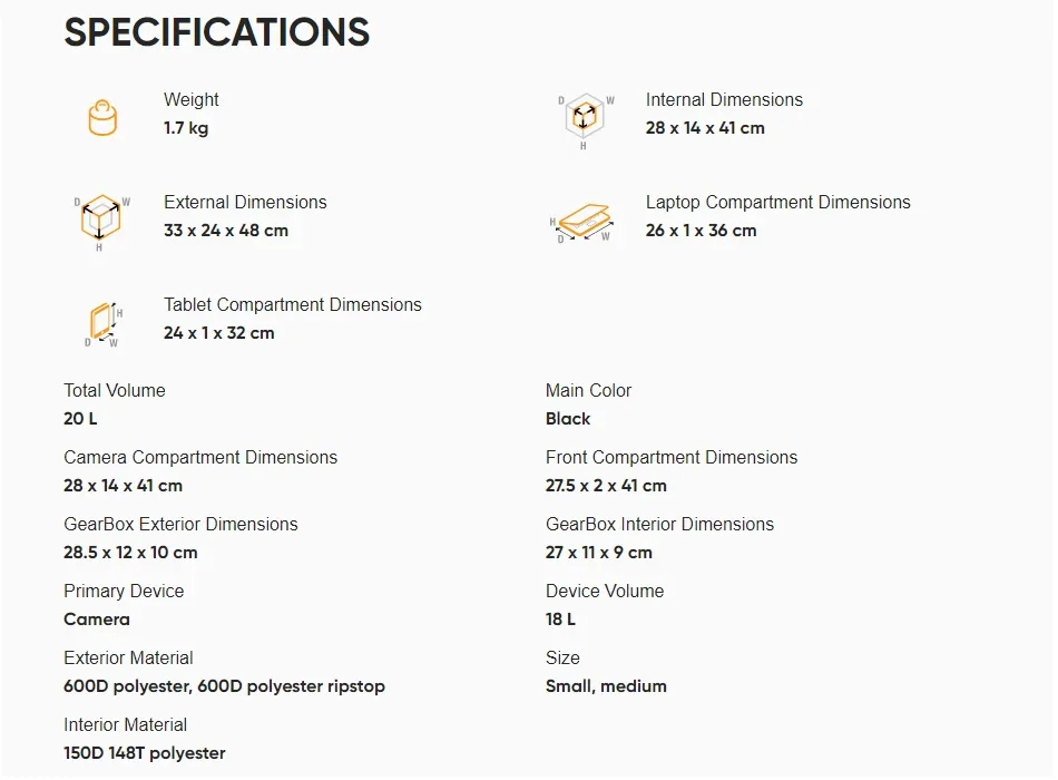 Les fermetures éclair YKK® de 10 mm améliorées offrent une ouverture et une fermeture plus fluides, tandis que les renforts avant moulés en EVA assurent une protection accrue de votre matériel précieux lorsque le sac est posé. La housse All Weather Cover™ protège votre équipement de la pluie, de la neige, de la poussière et du sable. Rangez-y votre appareil photo reflex numérique ou hybride avec poignée portrait et objectifs, ou un drone compact, ainsi qu'un trépied compact, un ordinateur portable de 15 pouces et une tablette de 10 pouces. Panneau de rangement avant et pochette rembourrée amovible pour accessoires inclus.
