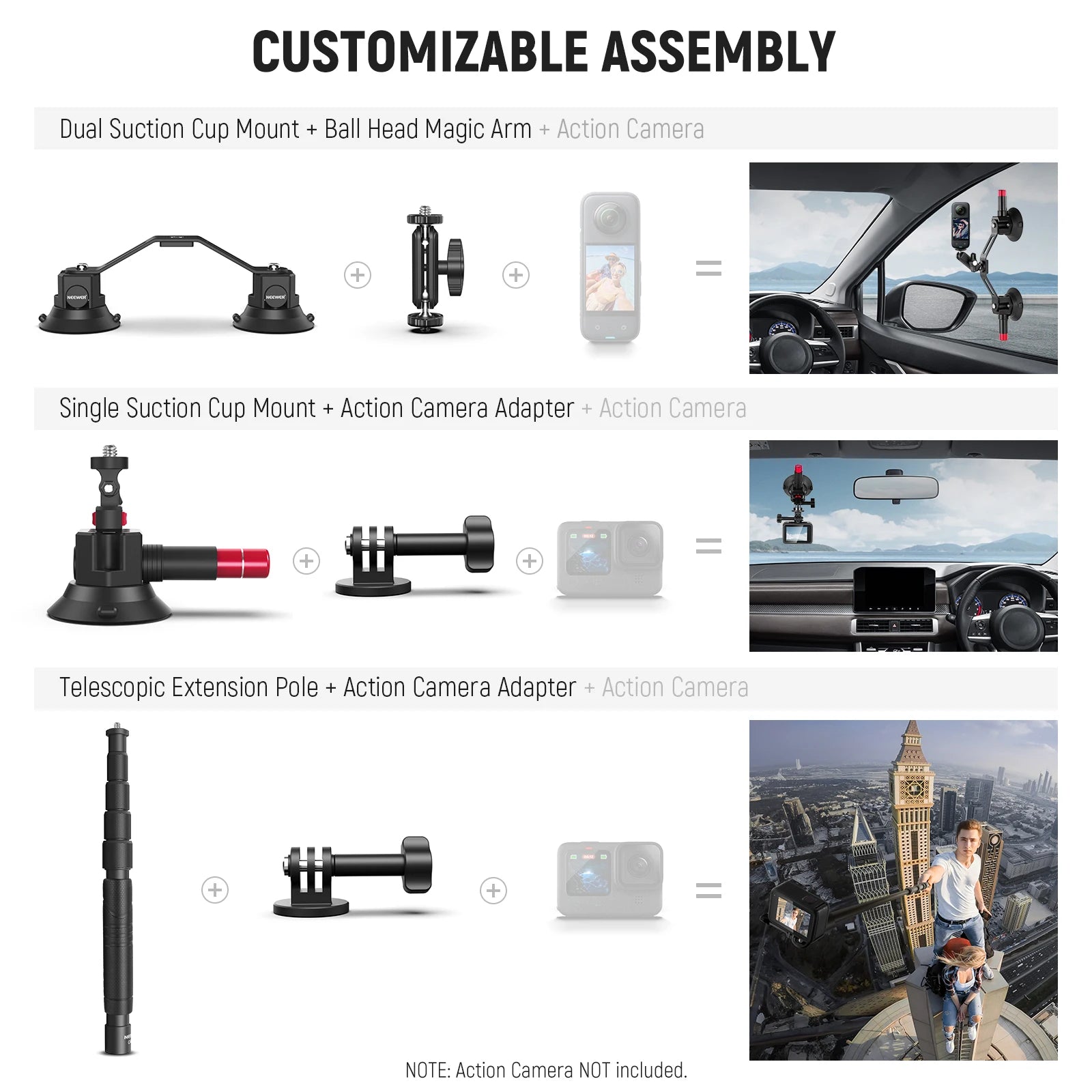 【Adaptateur de caméra d'action inclus】Le support à ventouse unique, le poteau télescopique et le poteau d'extension court sont tous équipés d'une vis de montage 1/4" pour un montage polyvalent de caméras de vlog sans miroir, de caméscopes, de supports de téléphone, d'adaptateurs de caméra d'action, et plus encore (uniquement l'adaptateur de caméra d'action est inclus).L'adaptateur de caméra d'action est compatible avec DJI OSMO Action 4 3 2 Hero 12 11 10 9 Insta360 X3 X2, etc.