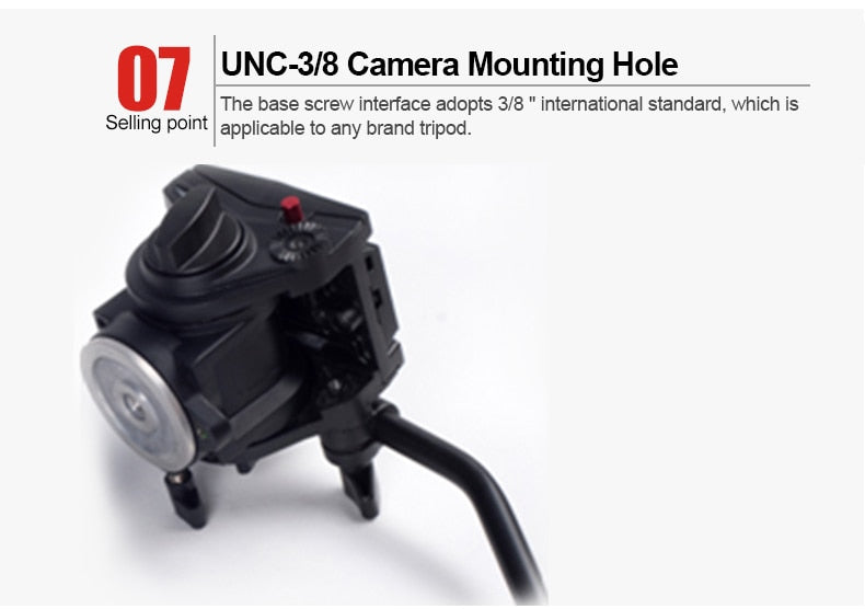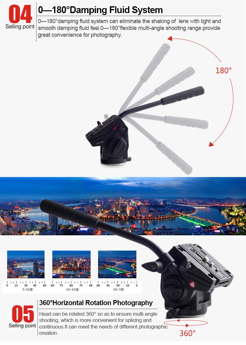 Il fait un panoramique à 360 degrés et s'incline à 180 degrés et est livré avec un bras panoramique amovible du côté droit et une plaque à dégagement rapide de 3/8 et 1/4 pouces. Le filetage du support de trépied en bas est de 3/8 "peut être converti en 1/4 de pouce avec une bague de réduction incluse pour une compatibilité avec tous les trépieds.