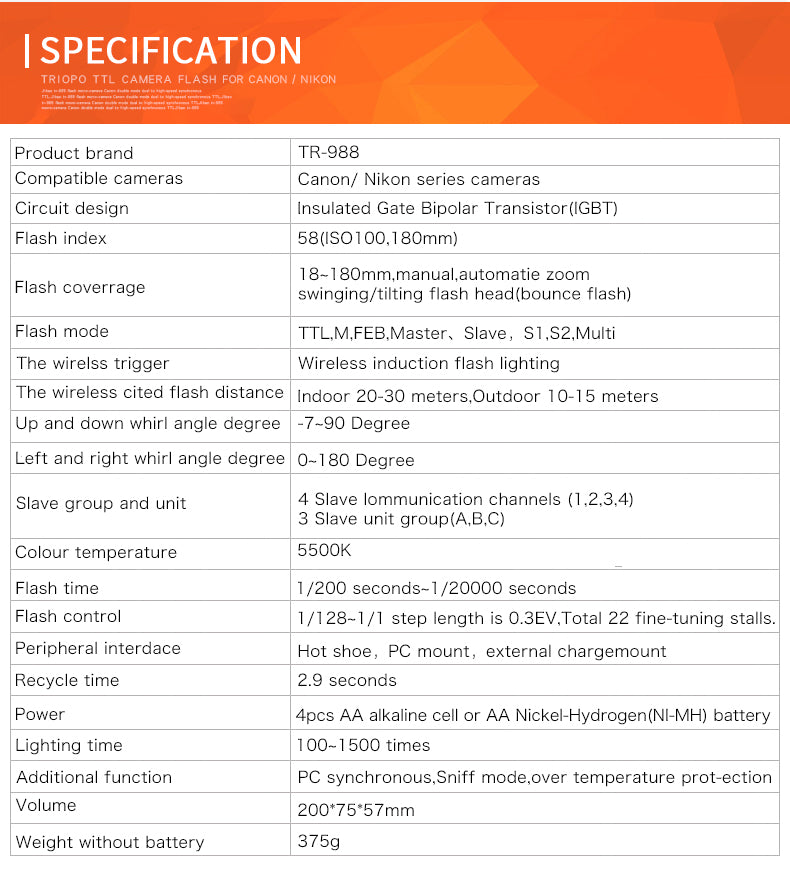 Flash Professionnel Speedlite TRIOPO TR-988 TTL pour canon et Nikon