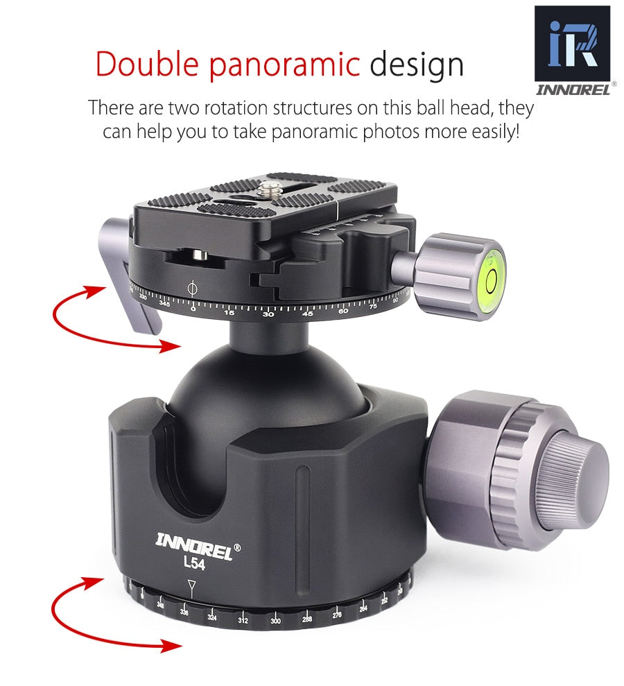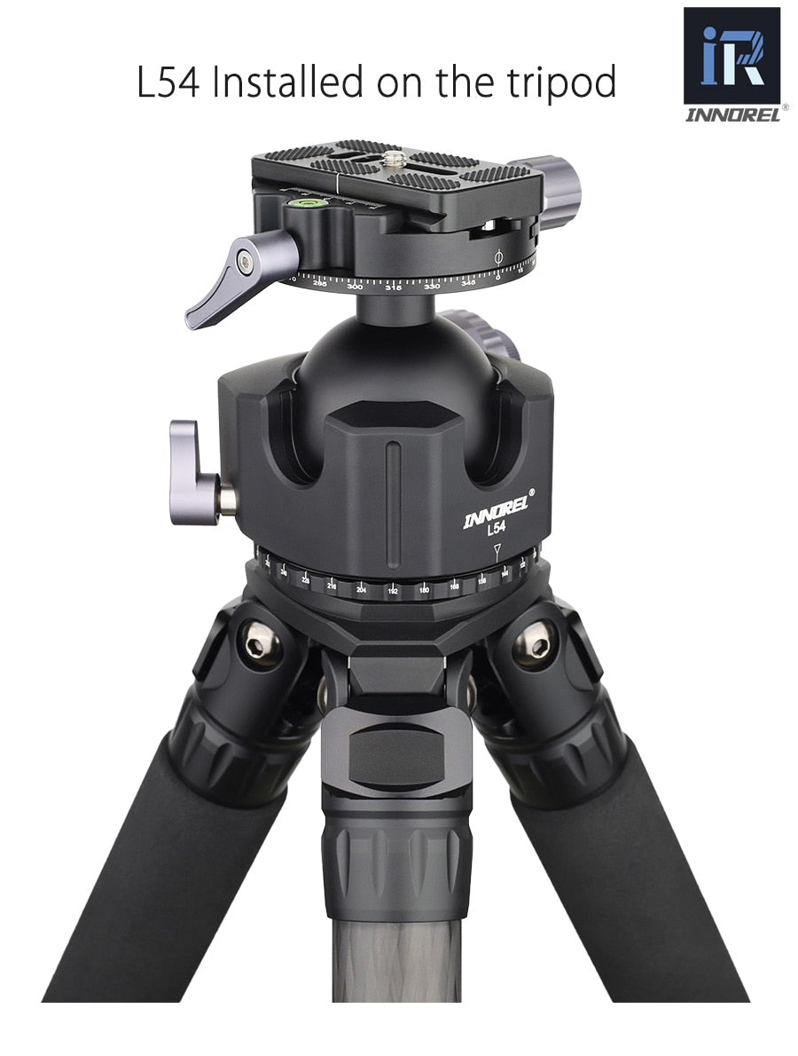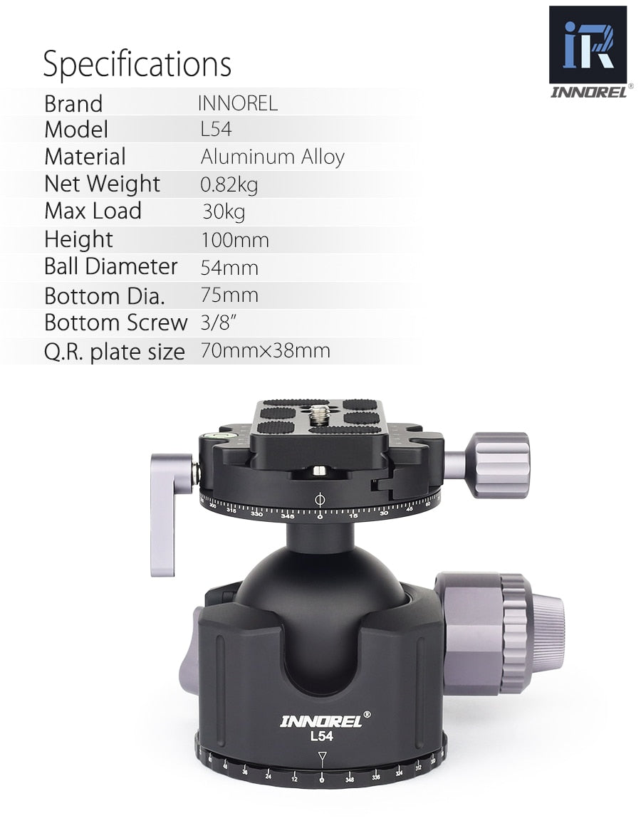 Marque: INNOREL Modèle: L54 Matériau: En Alliage D'aluminium Poids Net: 0.82 kg Max Charge: 30.0 kg Hauteur: 100mm Boule Diamètre: 54mm Diamètre du fond: 75mm Vis inférieure: 3/8» Taille de la plaque: 70mm × 38mm