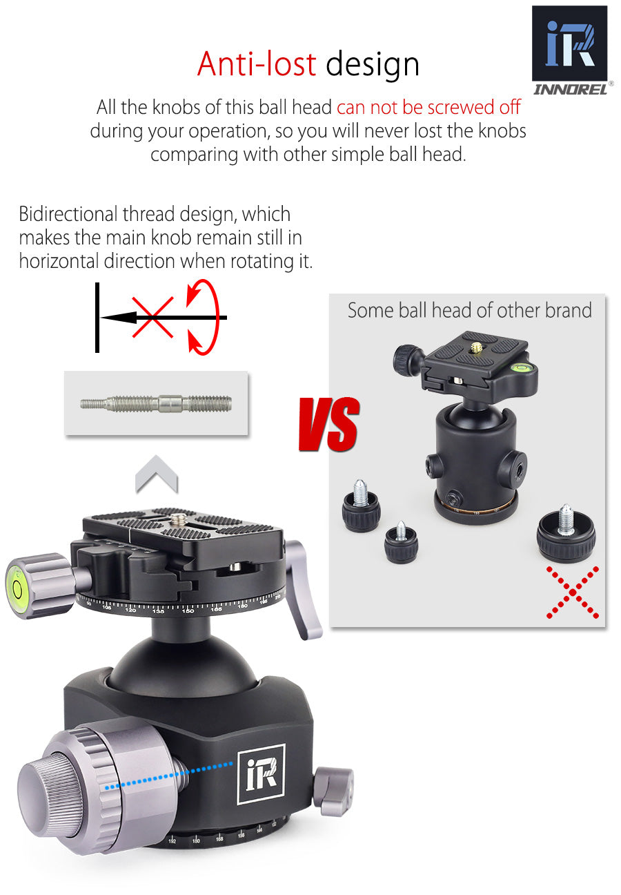 1. Cette rotule possède un centre de gravité bas, elle est stable et compacte elle a une structure plus professionnelle. 2. Il y a deux encoches en U sur le corps principal de la rotule, pour plus de positions de caméra disponibles, vous pouvez ajuster l'angles que vous voulez. 3. Cette rotule à réglage d'amortissement Constant, vous pouvez ajuster le bouton de réglage d'amortissement pour obtenir l'amortissement de la rotule que vous voulez. 4. La structure de la rotule est une sphère creuse qui la rend plus légère et plus portable, vous pouvez l'emmener partout où vous voulez. 5. Cette rotule a une vraie sphère de 54/44mm, qui peut charger votre appareil photo lourd et votre objectif facilement. 6. Il y a deux structures de rotation sur cette tête de rotule, elles peuvent vous aider à prendre des photos panoramiques plus facilement.